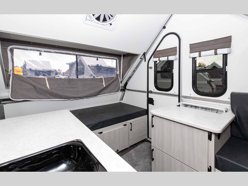This camper is built lightweight with an Azdel composite roof/sidewalls for added durability, and there are four stabilizer jacks for stability. The interior provides sleeping accommodations on a front bed or the converted dinette, a sink to wash up, and storage for your clothing, gear and more.
