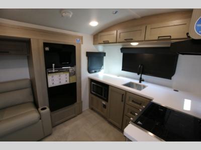 Are you looking for a lightweight trailer with at-home comforts? Take a look at this single slide out unit that can sleep three to four each night. There is a queen-size bed in the back with a 26" x 80" flip-up bunk for cozy sleeping space, a 72" sofa with cupholders to relax on, plus a 12V TV for movie nights! The front kitchen includes a 12V refrigerator to store food, plus a microwave oven and a gas oven to cook meals each day.