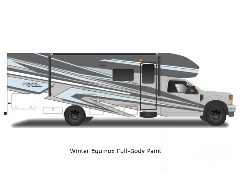 Sleeps 5 Slides 1 Length 31 ft 4 in Ext Width 8 ft 5 in Ext Height 12 ft 6 in Int Height 7 ft Interior Color Stillwater Exterior Color Standard Partial Paint. Full-Body Paint Choices; Harvest Moon, Icy Blast, Summer Solstice, Winter Equinox Hitch Weight 12000 lbs GVWR 19500 lbs Fresh Water Capacity 53 gals Grey Water Capacity 31 gals Black Water Capacity 31 gals Tire Size 225/70R19.5G Furnace BTU 3000 btu Generator Onan 6,000W Fuel Type Diesel Engine 6.7L Power Stroke V8 Turbo Diesel Chassis Ford F550 4x4 Horsepower 330 hp Fuel Capacity 67 gals Wheelbase 212 in Number Of Bunks 1 Available Beds Queen Murphy Torque 950 ft-lb Refrigerator Type 12V Refrigerator Size 10 cu ft Cooktop Burners 3 Shower Size 30" x 36" Number of Awnings 1 LP Tank Capacity 24 lbs Water Heater Capacity 10 gal Water Heater Type Gas/Electric AC BTU 15000 btu TV Info LR LED 50" HD Smart TV, Ext. LED HD Smart TV Awning Info 19' Electric with LED Lights Gross Combined Weight 31500 lbs Shower Type Standard Electrical Service 50 amp Similar Floorplans