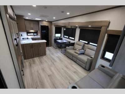 Sleeps 5 Slides 3 Length 33 ft 3 in Ext Width 8 ft Ext Height 12 ft 4 in Interior Color Mink, Pebble Exterior Color Polar White Hitch Weight 1590 lbs GVWR 11500 lbs Dry Weight 9490 lbs Cargo Capacity 2010 lbs Fresh Water Capacity 55 gals Grey Water Capacity 90 gals Black Water Capacity 50 gals Tire Size 16" Furnace BTU 35000 btu Available Beds Queen Refrigerator Type French Door Style Refrigerator Size 12 cu ft Cooktop Burners 3 Shower Size 30" x 36" Number of Awnings 1 Axle Weight 7900 lbs LP Tank Capacity 30 lbs Water Heater Type On Demand Tankless AC BTU 15000 btu TV Info LR 43" Smart LED TV, Ext. Smart LED TV. Awning Info 14' Electric with LED Lights Axle Count 2 Washer/Dryer Available Yes Number of LP Tanks 2 Shower Type Standard Electrical Service 50 amp Similar Fifth Wheel Floorplans